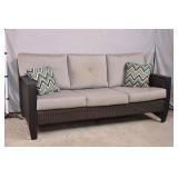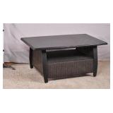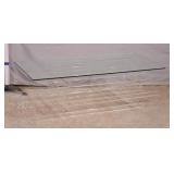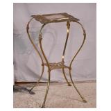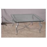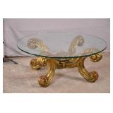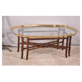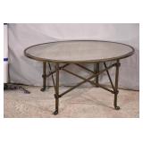 Oval metal base coffee table with "antiqued" beveled glass top; 737-2944 - paw feet - x brace sides - 36x24x17.5