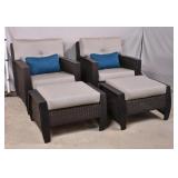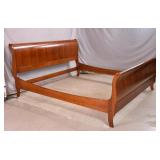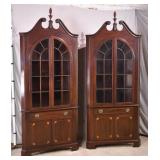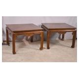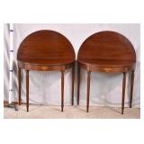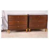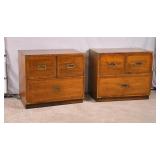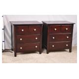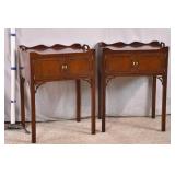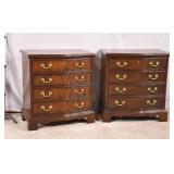 Pair of Drexel Heritage inlaid crotch mahogany 4 drawer bedside chests; 68-136 - serpentine front - banded top - (light scratches in tops; spot in finish on one top) - 28x17.5x30