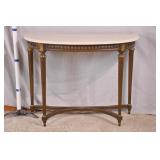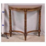 Ornate walnut half round console table with brass trim; 68-203 - fluted columns - stretcher base - turned legs - (small chip of veneer on 1 leg) - 30x12.5x29.5