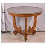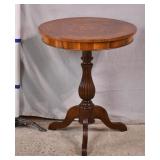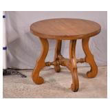 Round pine side table; 736-335 - turned stretcher base - (finish as-is; slightly loose) - 26x26x21.5