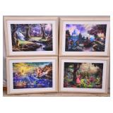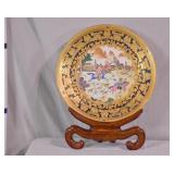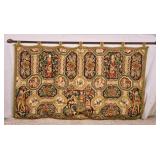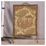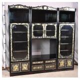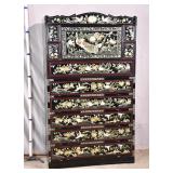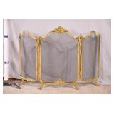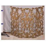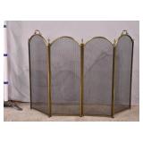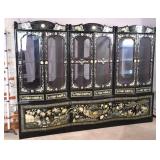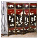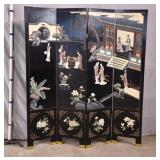 Oriental style 4 panel folding room divider; 737-2805 - 3D style iridescent shell figures - black and gold painted on back - brass toe caps - 71.5x72