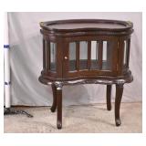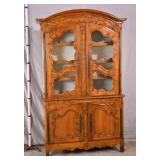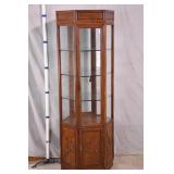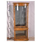 Bow front curio cabinet; 74-6805 - lighted interior with glass shelves - tinted mirror back - (chips in veneer; finish as-is) - 30x18x72.5