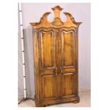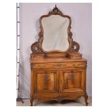 Carved walnut French style dresser with beveled mirror; 74-6389 - marble top - raised panel sides and doors - fitted interior - (finish as-is) - 48.5x21x86