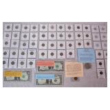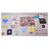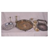 Group of misc silver plate items; 1068-005,006,007,008,009,010,011 - large round footed tray with reticulated gallery; 17.75x17.75x2.5 - pair of candle stands, round tray, 4 coasters, large bowl, footed casserole stand, cup