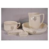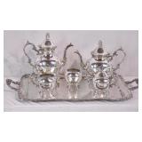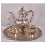 Gorham 3 piece sterling silver coffee set with sterling tray; 1068-000,002,003 - pitcher; 9x5x10.5; 21.0 oz US; (ding on side) - creamer; 4x2.75x4; 3.7 oz US - sugar with lid; 5x3.5x5; 5.4 oz US - round tray; 14.25; 32 oz US