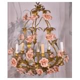 Ornate metal 6 light chandelier; 736-338 - ceramic rose petals - 19x19x22