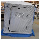 FISH TRAP X2 FISH HOUSE MODEL 8237 THIS IS A TWO MAN FISH HOUSE IN VERY CLEAN CONDITION. IT COMES WITH A SOLID TOW BAR, WITH HITCH. A CUSTOM MADE CENTER CONSOLE. TWO FOLDING SEATS,WITH A SOLID PLYWOOD FLOOR. ADDITIONAL SUPPORT RODS ARE STORED NEATLY AND SECURELY ON THE BACK WALL OF THE SLED.. THERE WAS A SMALL HOLE IN THE FABRIC THAT WAS NEATLY REPAIRED WITH ORIGINAL X2 FABRIC. ALSO INCLUDED IS ADDITIONAL ORIGINAL X2 FABRIC FOR FUTURE REPAIRS. THIS COMES WITH A HEAVY DUTY TRANSPORT COVER. THIS FISH HOUSE HAS BEEN WELL TAKEN CARE OF AND IN EXCELLENT CONDITION. PLEASE SEE PHOTOS FOR DETAIL. THERE IS A RESERVE ON THIS ITEM