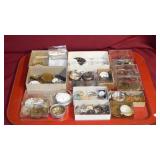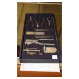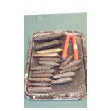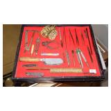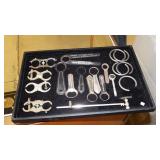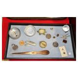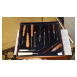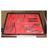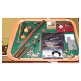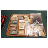VINTAGE WATCH MAKERS & JEWELERS TOOLS: ENGRAVING CHISELS, MAIN SPRING WINDER, MAIN SPRING PUNCH, HAND VISE, PLIERS, DRAW TOOLS, DRAW TONGS, THREAD CHASERS, GAUGES, ETC.. SELECTION OF WATCH & CLOCK PARTS (CRYSTALS, DIALS, HANDS, MAIN SPRINGS, ETC..)