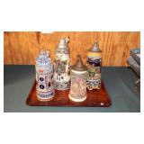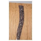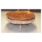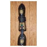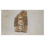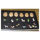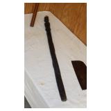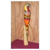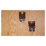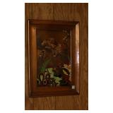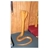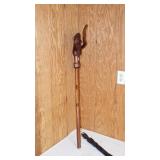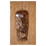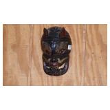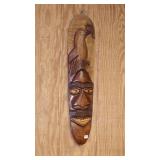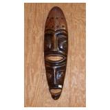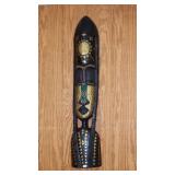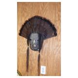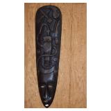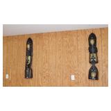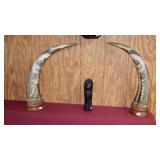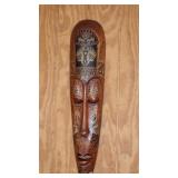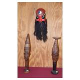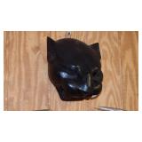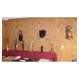 COLLECTION OF AFRICAN ART CEREMONIAL MASKS, 35" ROUND COWHIDE DRUM TABLE, BLACK PANTHER HEAD WALL HANGING, WOOD AFRICAN ART BUST, WALKING STICK & STATUES. WOOD TOUCAN BIRD STATUE, PAIR WATER BUFFALO CARVED HORNS (DRAGON STYLE), WOOD COBRA STATUE, (3) BUTTERFLY ART TRAYS. (2) COPPER & ENAMEL ART WALL HANGINGS BY ALBERT GILLES(19 1/2"x25") TIGERS & PANTHERS.