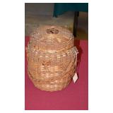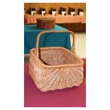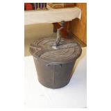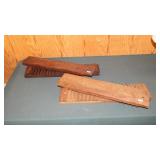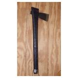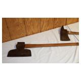 No. 4 UNIVERSAL BREAD MAKER, BROAD AX, FIREMAN'S AX, (2) 20 CIGAR WOOD MOLDS, (2) CARVED WOOD WHISTLING GENT FINIALS, CROCKS, PICNIC BASKET.