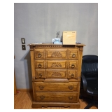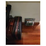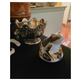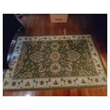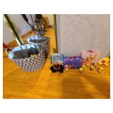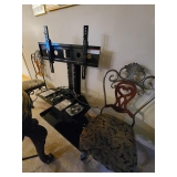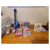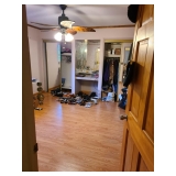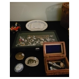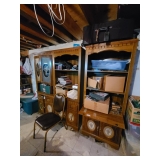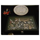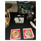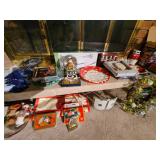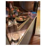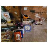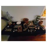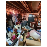 Living Room: Rugs, assortment of jewelry, watches, Micky Mouse clock, luggage, ceramic dishes, holiday decorations, TV stand with mount, vintage wood furniture