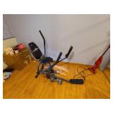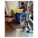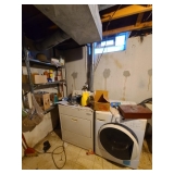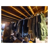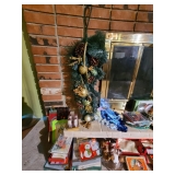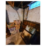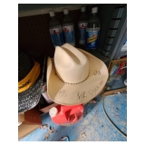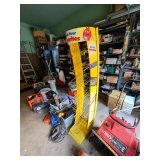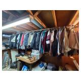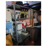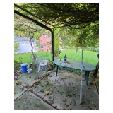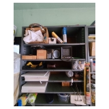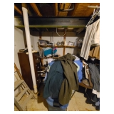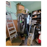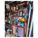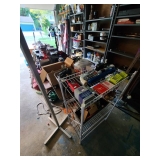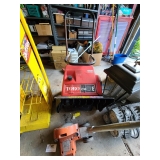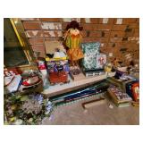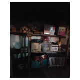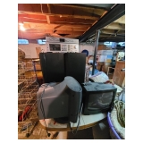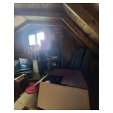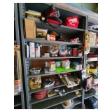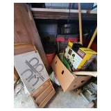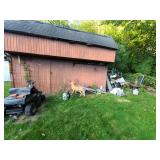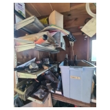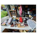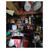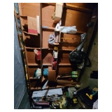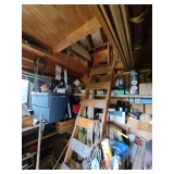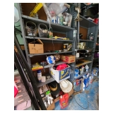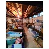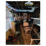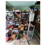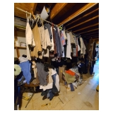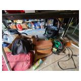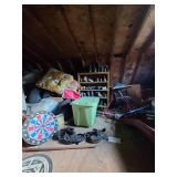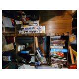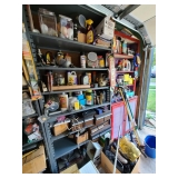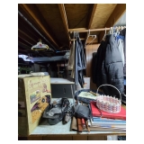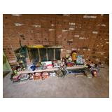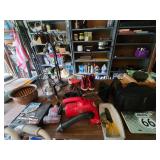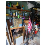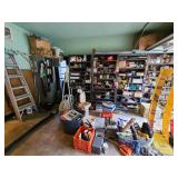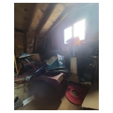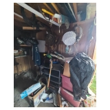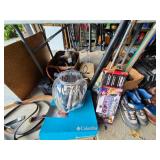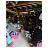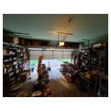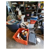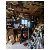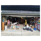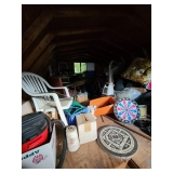 Outdoors: Shop tools, plastic chairs, dart board, work shoes, horseshoes game, outdoor statues, cleaning supplies, soccer balls, autographed hat, leaf blower, work bags, Toro snowblower