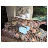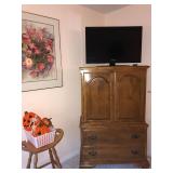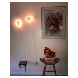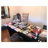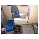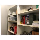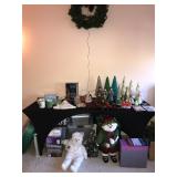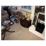 Living Room: Coats, lamps, books, linen, LED light bulbs, cleaning supplies, office supplies, wall art, holiday decorations, Christmas ornaments, Dynex TV