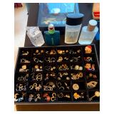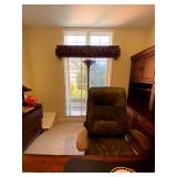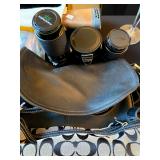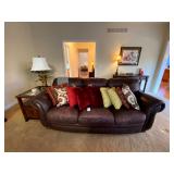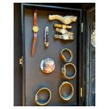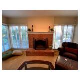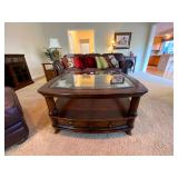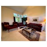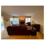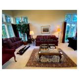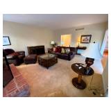 Living Room: Couch set, ottoman, lounge chairs, coffee table, indoor plants, end table, lamps, air rifles, medals, rug, necklaces, rings, earnings, perfume, watches, Coach purses, camera lenses, Nikon camera, gun ammo, glass coffee table, leather furniture