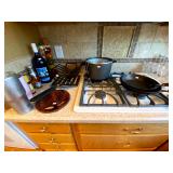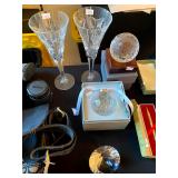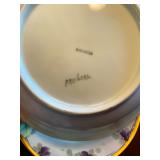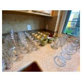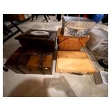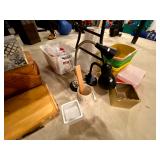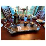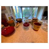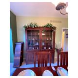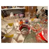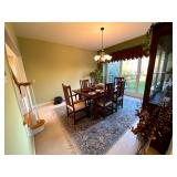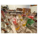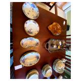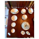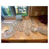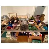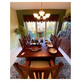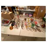 Kitchen: Wood dining room set, silver tea cup set, fine plates, glass sets, mugs, glass serving dishes, bowls, dish sets, jars, cooking molds