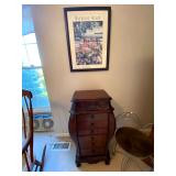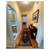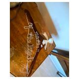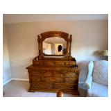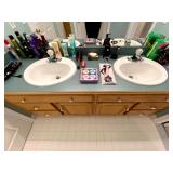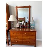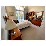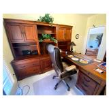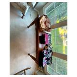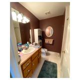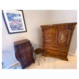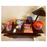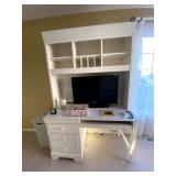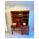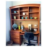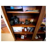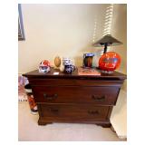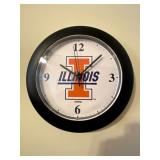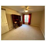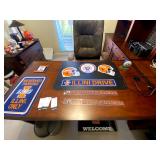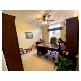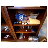 Upstairs: Wood desk, office chair, University of Illinois art, wood book shelves, landline phones, Detroit Tigers souvenirs, clocks, bed sets, Phillips television, full mirror, outerwear, dresses, shampoo, bathroom supplies, shoes