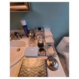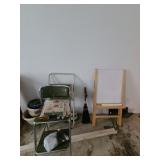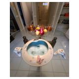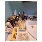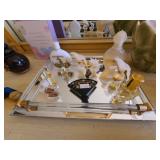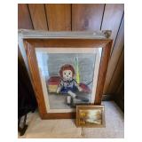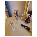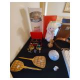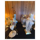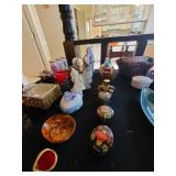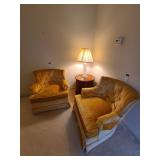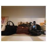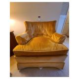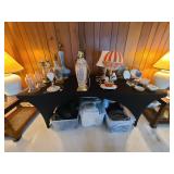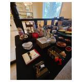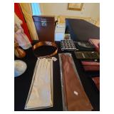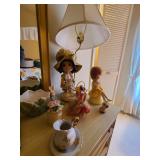 Cashout: purses, gloves, perfume, vintage brush and mirror, dolls, keystone camera, mid-century renoir, copper belt, records, books, girl scout patches, round back armchairs, end table by heritage, lamps, floral painting by Dubois, vintage embroidered couch by heritage