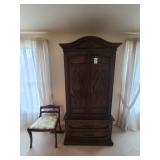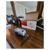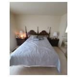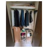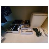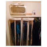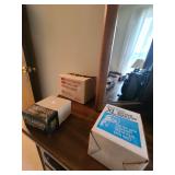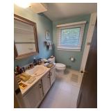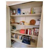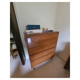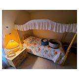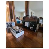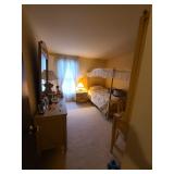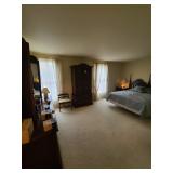 Upstairs: Thermal paq, hair care items, tall dresser by kroehler, twin size mattress/box spring and frame, storage headboard by Koehler, assorted games, clothes, books, luggage, wrapping paper, dresser with tri-fold mirror by unique, lamps, sears 126 camera, Argus holiday dual 848 camera, anscomatic S/80 camera, bedside tables by unique, king size headboard by unique, full size mattress/box spring and frame, wardrobe by unique, wicker rocking chair, women's shoes, panasonic vcr, blankets, vintage bookshelf desk, perfume bottles, vintage end table, twin size mattress/box spring and bed frame, vintage twin size canopy bed, ladies hats, Jaymar vintage toy piano, weights