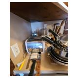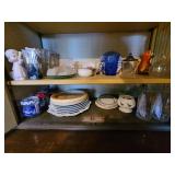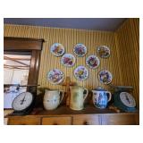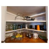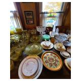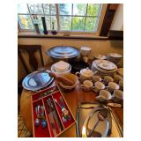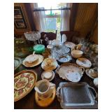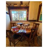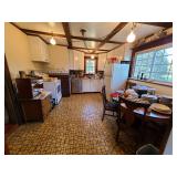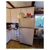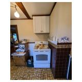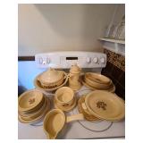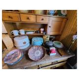 Hutch, Pfaltzgraff dishware, Tabletops Unlimited Dish Set, vintage bread box, Magic Chef Microwave, Hamilton Beach Slow Cooker, Kitchen aid food processor, GE stove, Refrigerator