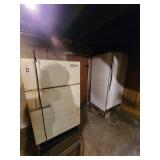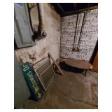Basement: GE freezer, chairs, coffee table, brooms, street sign