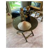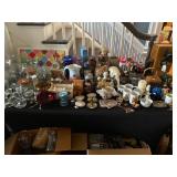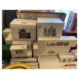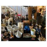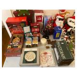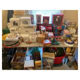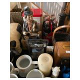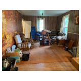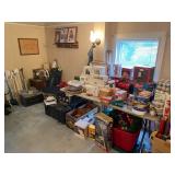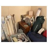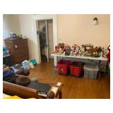 Upstair Bedroom 1: Christmas and Halloween decor, Heritage Village Collection, Sony boom box, Northpole 10pc family tent and shelter combo, Greatland captain quad chairs, window blinds, TV trays, folding chairs, framed map, VHS movies, floor standing globe, ironing boards, TherFlo Medical System mattress, Norman Rockwell art