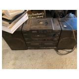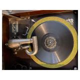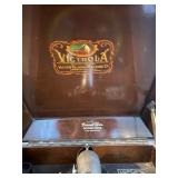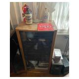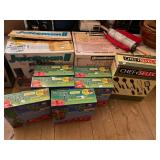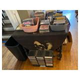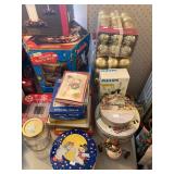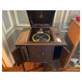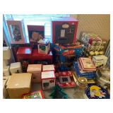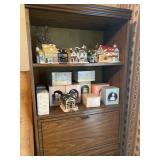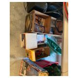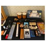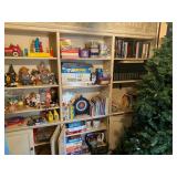 Living Room: Sherlock Holmes chess set, entertainment center, books, DVDs and VHS, fireplace tools, piano bench, antique Victorola record player, antique wall phone, clarinets, violin, Sony stereo equipment, antique trunk, oak file cabinet, toys, games, books, marionettes, Harley Davidson jacket, Christmas tree.