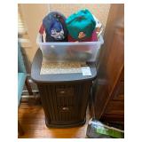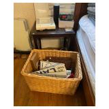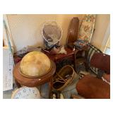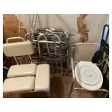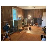 Bedroom 5: Pots and pans, plastic food storage and pitchers, 3 drawer file cabinet, Oreck and Bissell vacuums, vintage 80s Nike basketball, floor lamps, Drive clinical chair, telescope, vintage furniture and lamp, medical supply equipment: walkers, shower seats, toilet chairs