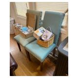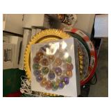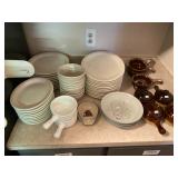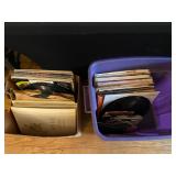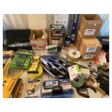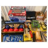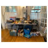 Dining Room: Tools, Air Mover high velocity fan, Bocce ball set, drill bits, paint and supplies, new in box Metabo blades, Coleman rechargeable lantern, camp chairs, vintage albums, CDs, music books and musical instruments, dining table and chairs, SPT air conditioner, All-Clad cast iron pan and cookware, ceramic bake, serve and store sets