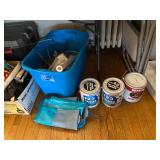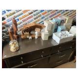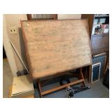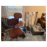 Bedroom 6: drafting table, Precious Moments, bookshelf, chalkboard, moving blankets, storage tubs