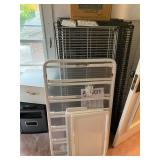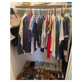 Bedroom 2: Luggage, barrister bookshelf, queen bed, womens clothing and shoes, Tweety Bird jacket, Halloween decor, Ikea shelving, Mason Air alternating pressure mattress