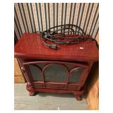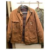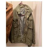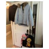 Upstair Hallway: Radio Flyer wagon, womens fur coat, vintage blanket lined Carhartt jacket, space heaters, linens