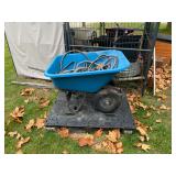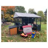 Outside: Wood yard swing, wheelbarrows, Little Tikes picnic table, covered animal kennel, dog crate, chiminea, hose reel, fire pit, gas cans
