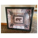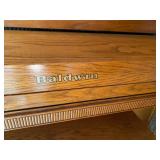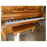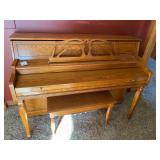Living Room: Baldwin piano, decorative statues, wood dresser, wall art, ammunition, boots