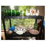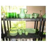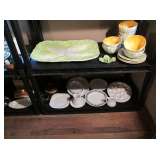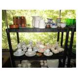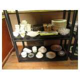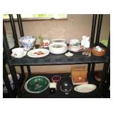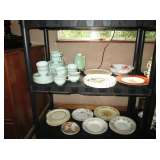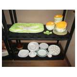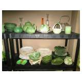 Collectible China: Green (looks like) Lily Pad but probably cabbage leaves Belo Portugal for Wm Sonoma, White Baru Portugal Floral set, White Leaf made in Portugal for Neuwirth, Green Water Lily Teapot, Lots of Bordallo Pinheiro Rainha Large Green Set includes 4 platters, 8 bowls, 1 Large serving bowl, 8 Plates, 8 Soups, 8 Saucers, 7 cups, 2 Creamers and 1 Pitcher, Green Handblown Glass Tumblers (Mexico?), Norchow Italy Lettuce Head Bowls, 4 Bordaro Pinheiro Portugal cabbage leaf bowls, E Rainha Cantaloupe Set originally purchased at I Magnin, Italy Cabbage Head Covered Server with spoon, Italy Cauliflower covered server with spoon, Sigma Tastesetter Large Platter and canister set, Fitz and Floyd Lettuce/onion basket, More china including Crown Devon, Mikasa, Porcelaine de Paris, Royal Staffordshire, Fitz & Floyd, Kensington Balmoral, Rosalie Cheery Chintz, Wedgewood, Haviland Limoges, Silesia, Ridgways, Siesta Ware mid-century tumbler set. Mid Century China set in aqua, plus much more.