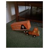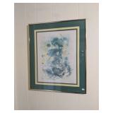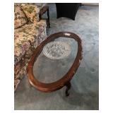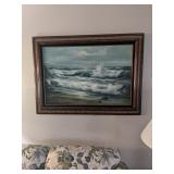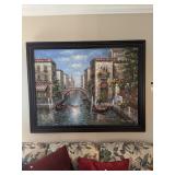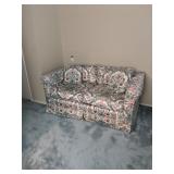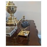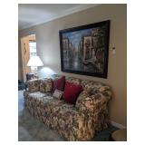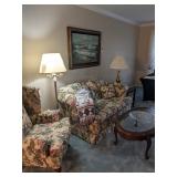 Living Room: Vintage pocket watch globe, hammery end table, floral loveseat, ocean wave painting, stiffle lamps, glass top coffee table, floral couch, Italian city painting, decorative chair by crate & barrel, Howard Miller clock, glass top end table, paintings, vintage tonka truck moving van
