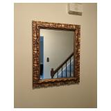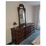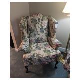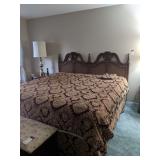 Bedroom 1: Wicker chair, king size bed and frame, and tables, vintage gold and white lamps, wall art, wardrobe, floral loveseat, cedar chest, dresser with mirror, AT&t phone