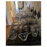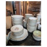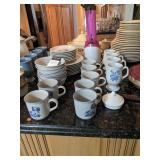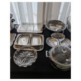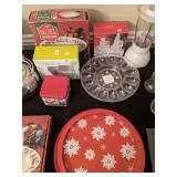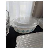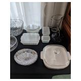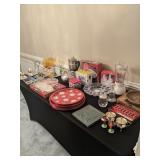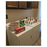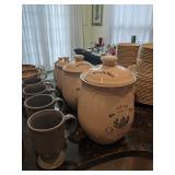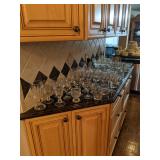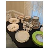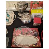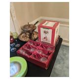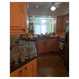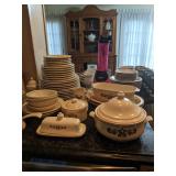 Kitchen: Glassware, Pfaltzgraff "Village" 50 pc set, mugs, pots and pans, munsey cooker fryer, vintage Pyrex, Yorktown Pflatzgraff set, Leigh Ware 108pc set 22k, Christmas glasses, serving dishes, silver plated serving wear, chocolate treat maker