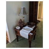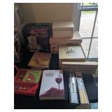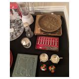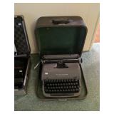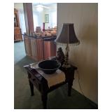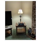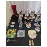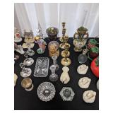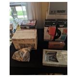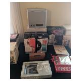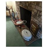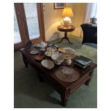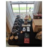 Family Room: Brass candlesticks, candle holders, decorative items, teacup and saucer, wall art, carafes, signed watercolor print, hutch, Crock-Pot, round end table, table lamps, cake plates, serving dishes, collectible plates. Ernest Hemingway collection by Thomasville end table and coffee table, room divider, GE video camera recorder 9-9086, Remington office riter typeriter, Samsung TV, coffee table, end table, table lamps, vases, wall art, Disney big Al cookie jar