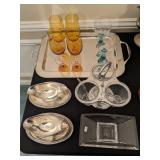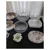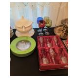 Dining Room: Glassware, silver plated chafing dish, silver plated gravy bowls, Christmas serving wear, host freeze cooling wine glasses, serving utensils, hand-painted goblets, wine glasses, soup server, Christmas dishes, dishe, floral painting