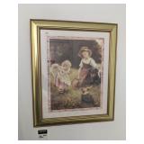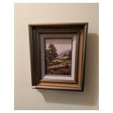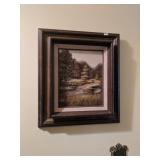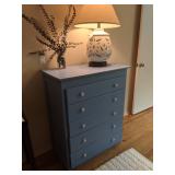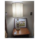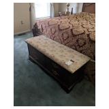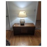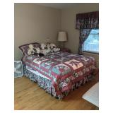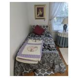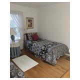 Bedroom 2: Stewart cedar chest, twin beds and frames, and table, wall art, quilt, vintage tennis rackets, lamps