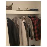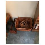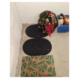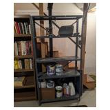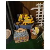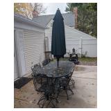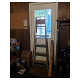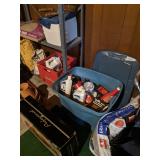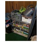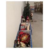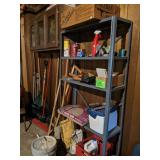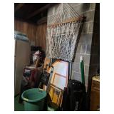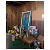 Basement: Christmas decorations, ornaments, wreaths, small tree, stockings, wood chairs, books, metal shelf, forecast suitcase, shelves with drawers. Outside: patio set with umbrella, fire pit, wood lounge chairs