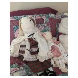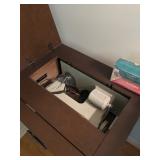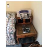 Bedroom 3: Full mattress and box spring, side table, lamps, Sears Kenmore sewing machine table, singer automatic zigzagger, blue dresser, box fans, bunny stuffed animals. Linens, CB radio, sewing kit