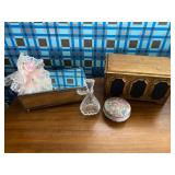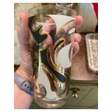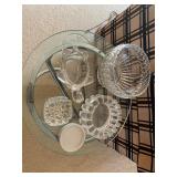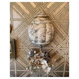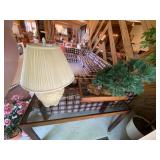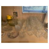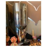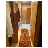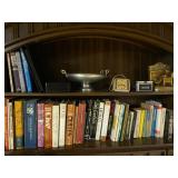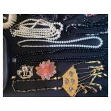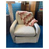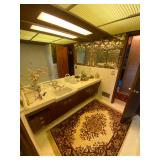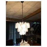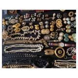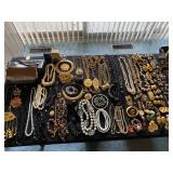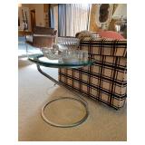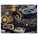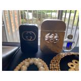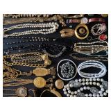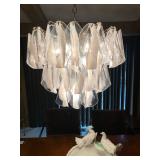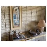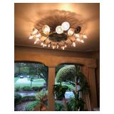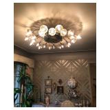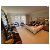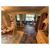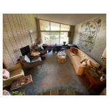 Living Room: Mid Century upholstered chairs and sofa, table clocks, silver serving dishes, vintage costume jewelry, Gucci perfumes, Coach purse, boxed ammo, Grandfather clock, hand blown Murano glass chandelier