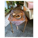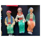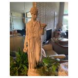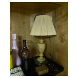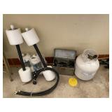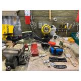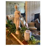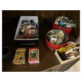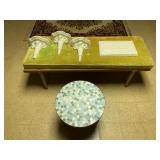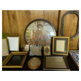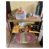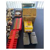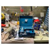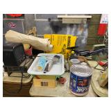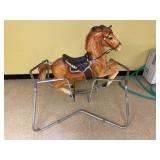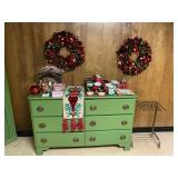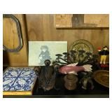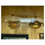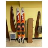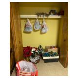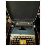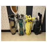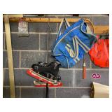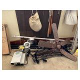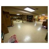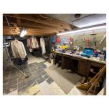 Basement: Christmas decor, screen art, picture frames, upholstered bench, tile top round table, mid century modern art and decor, antler mounts, trophies, Smith Corona typewriter, sewing notions, green dresser and corner cupboard, Papyrus Christmas cards, vintage water skis, gun cases, vintage golf bags and golf clubs including MacGregor Tourney, MacGregor eye-o-matic, Wilson, Accubar, Toney Penna, Yamaha and Nicklaus. Vintage ride on spring horse, games, luggage, vintage clothing, tools, Bauer ice skates, Wilton vise
