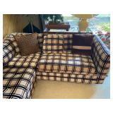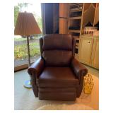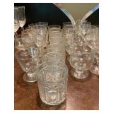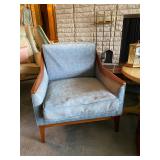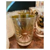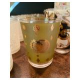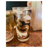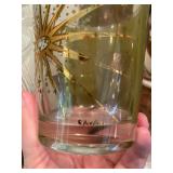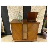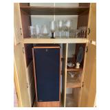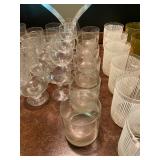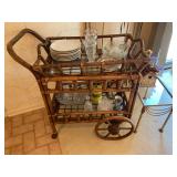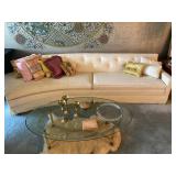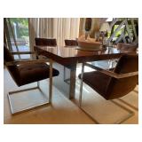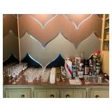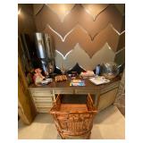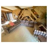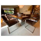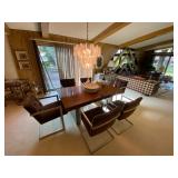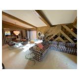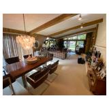 Family Room: Milo Baughman dining table and chairs, rattan bar cart and desk chair, mirrored hutch, mid century modern sectional, leather swivel, glider recliner, Pasinski bar glasses