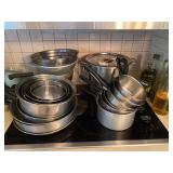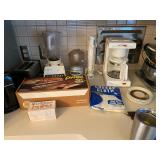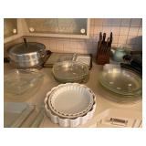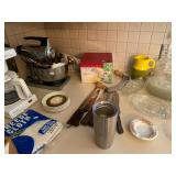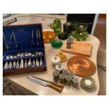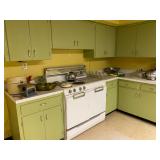 Kitchen: Mid century modern bar stools, cookbooks, vintage cake decorators, Holmes & Edwards flatware, Pyrex, vintage mixer, pasta maker, pots and pans