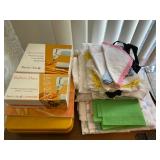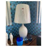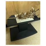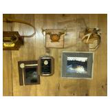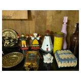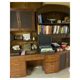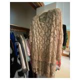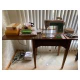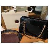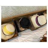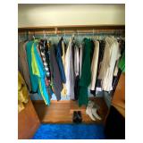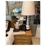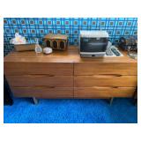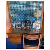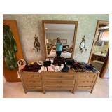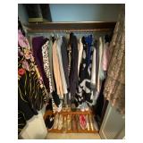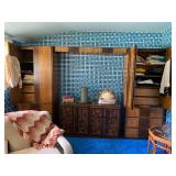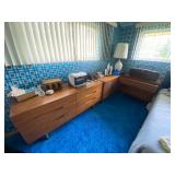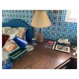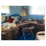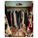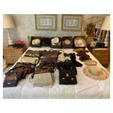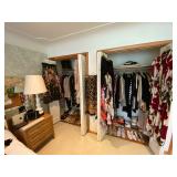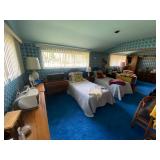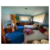 Bedrooms: Vintage clothing including coats, dresses, skirts, pants, blouses, suits, hats, gloves, scarves and shoes. Vintage handbags, Singer sewing machine, American by Martinsville mid century modern dressers, nightstands, desks and chairs. Framed mid century modern owl art by Layton, mid century modern upholstered double twin headboard, taxidermy puffer fish, mid century modern lamps