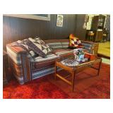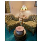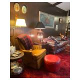 Living Room: Vintage, rugs, coffee table, lounge chair, vases, lamps, wall mirror, couch, lounge chairs, baskets, Insignia stereo, radio