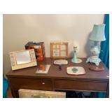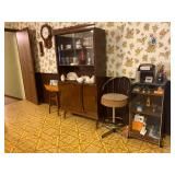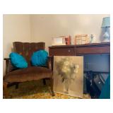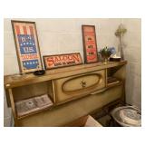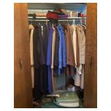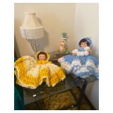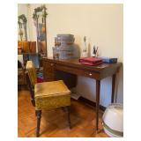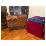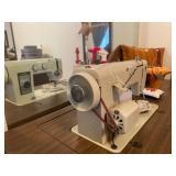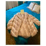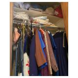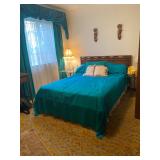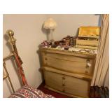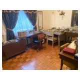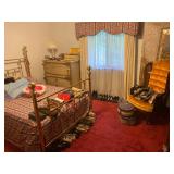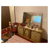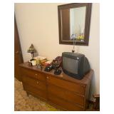 Bedroom: Bed set, dolls, glass end table, wood dresser, hand mirror, fur coat, clothing, television, Signature sewing machine, fur coats