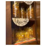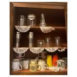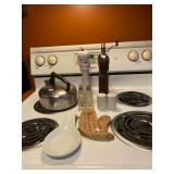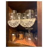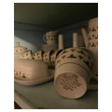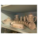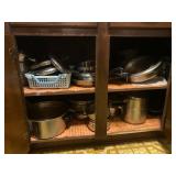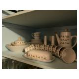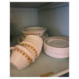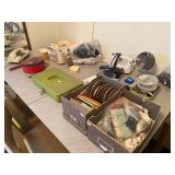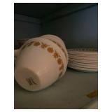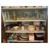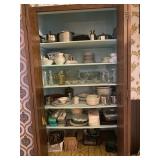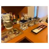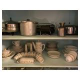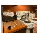 Kitchen: Glass sets, pots and pans, glass serving dishes, ceramic cups, plate sets, tea pot, toaster, coffee maker, wine glasses, tea cups, dining room set